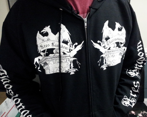 Official Ares Kingdom zip-up hoodies are in stock now! All pre-orders will go out tomorrow morning. Note that the camera washed out some of the fine detail in the first pic -- no substitute for the real thing!